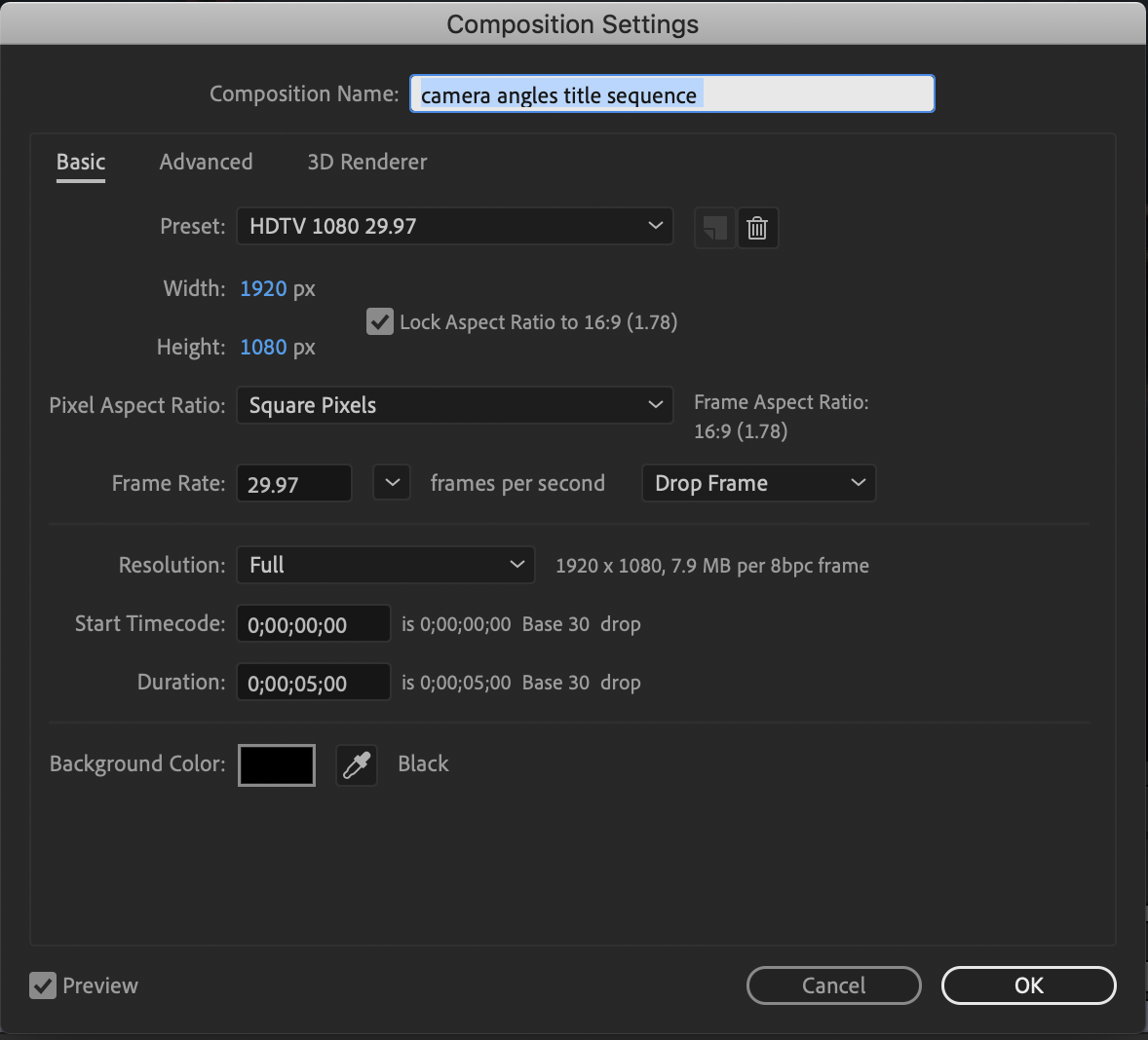 We begun by making a composition on Adobe After Effects. I then set my time duration to 5 seconds and made sure my comp width was 1920 and height was 1080.